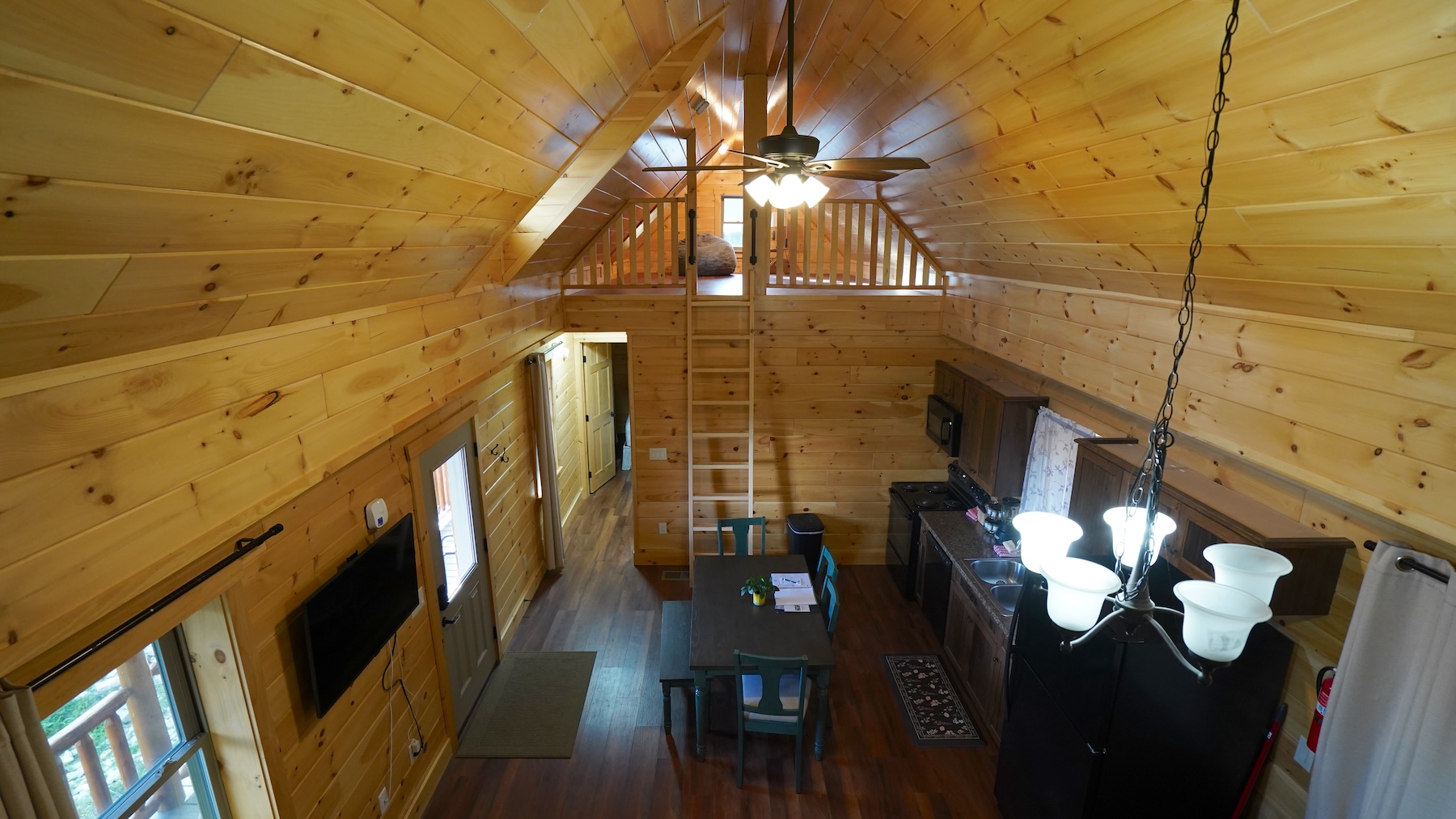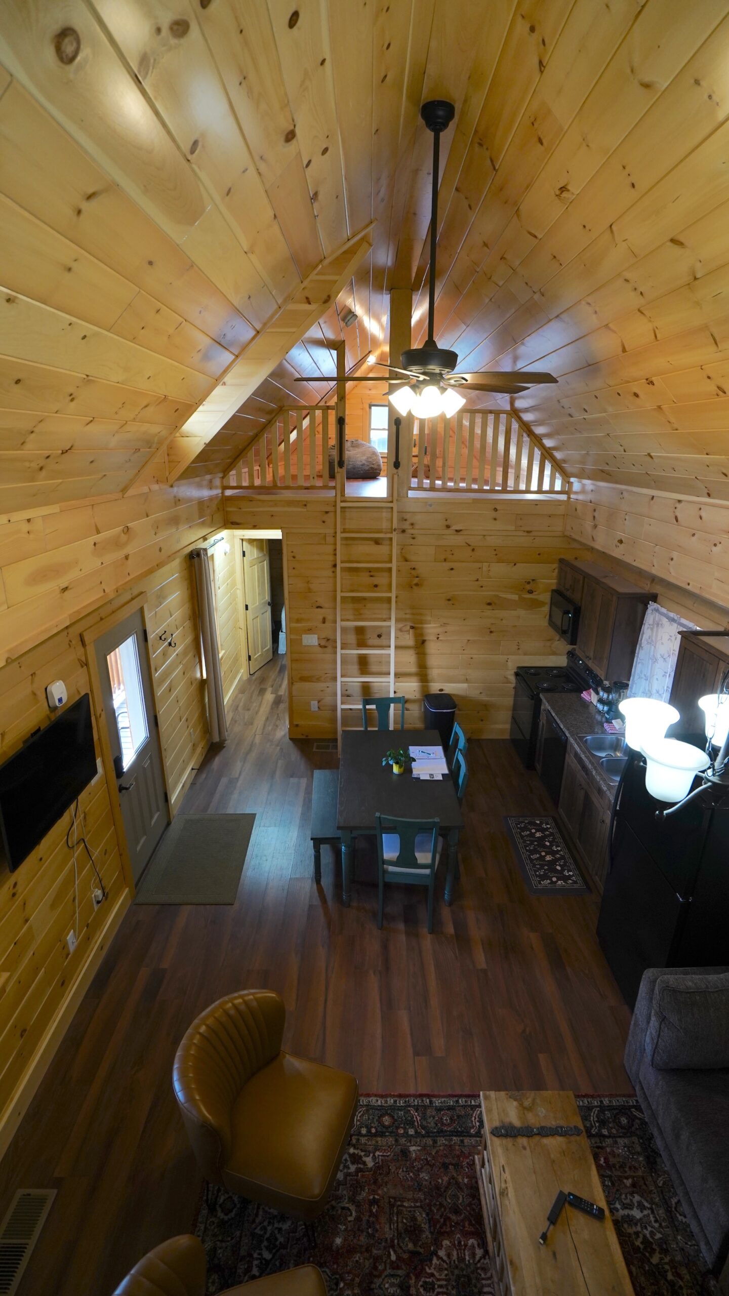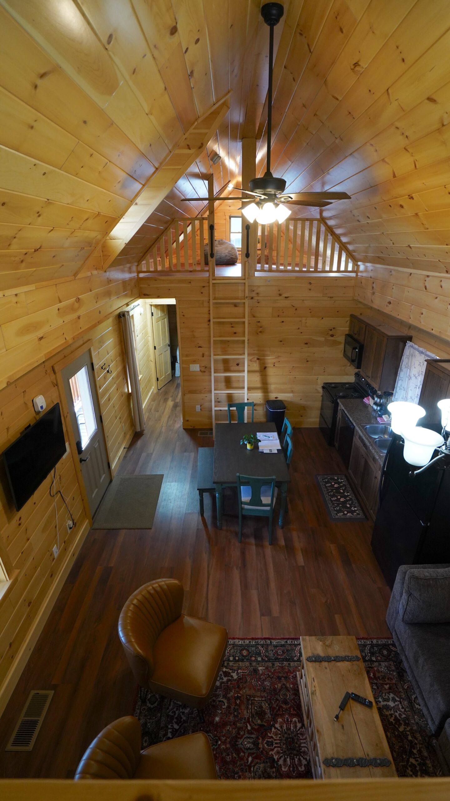 On either end of the main living space, you’ll find two private bedrooms, each offering easy comfort for adults. Above them, accessed by built-in ladders, are two open lofts—an adventurous hideaway for kids or the young at heart. With room for up to four adults and four children, this cabin balances shared space and privacy in a layout that feels both fun and functional.