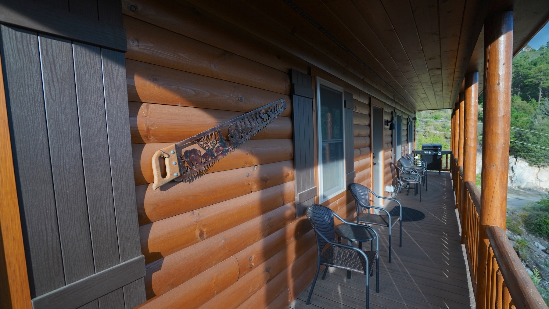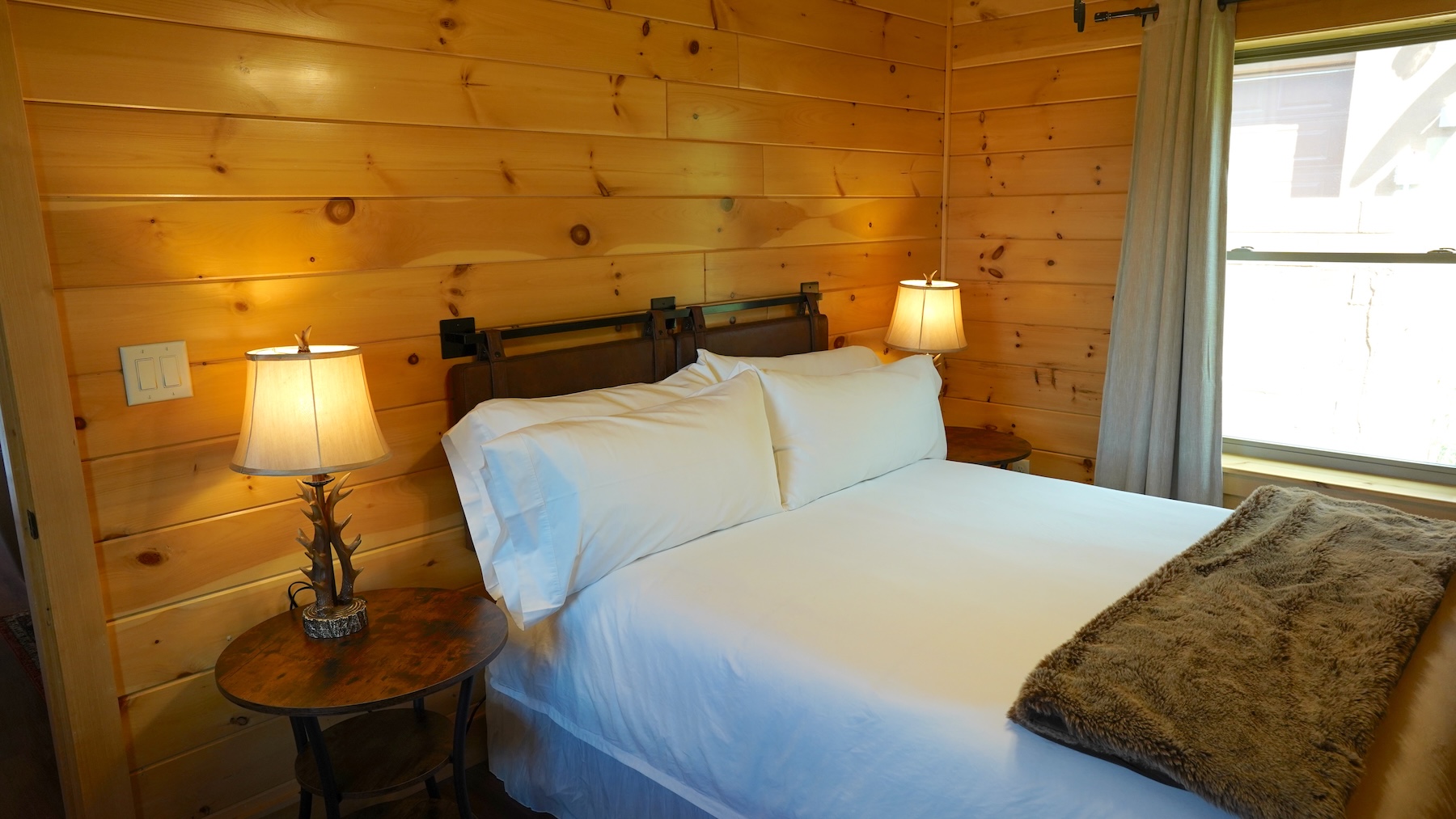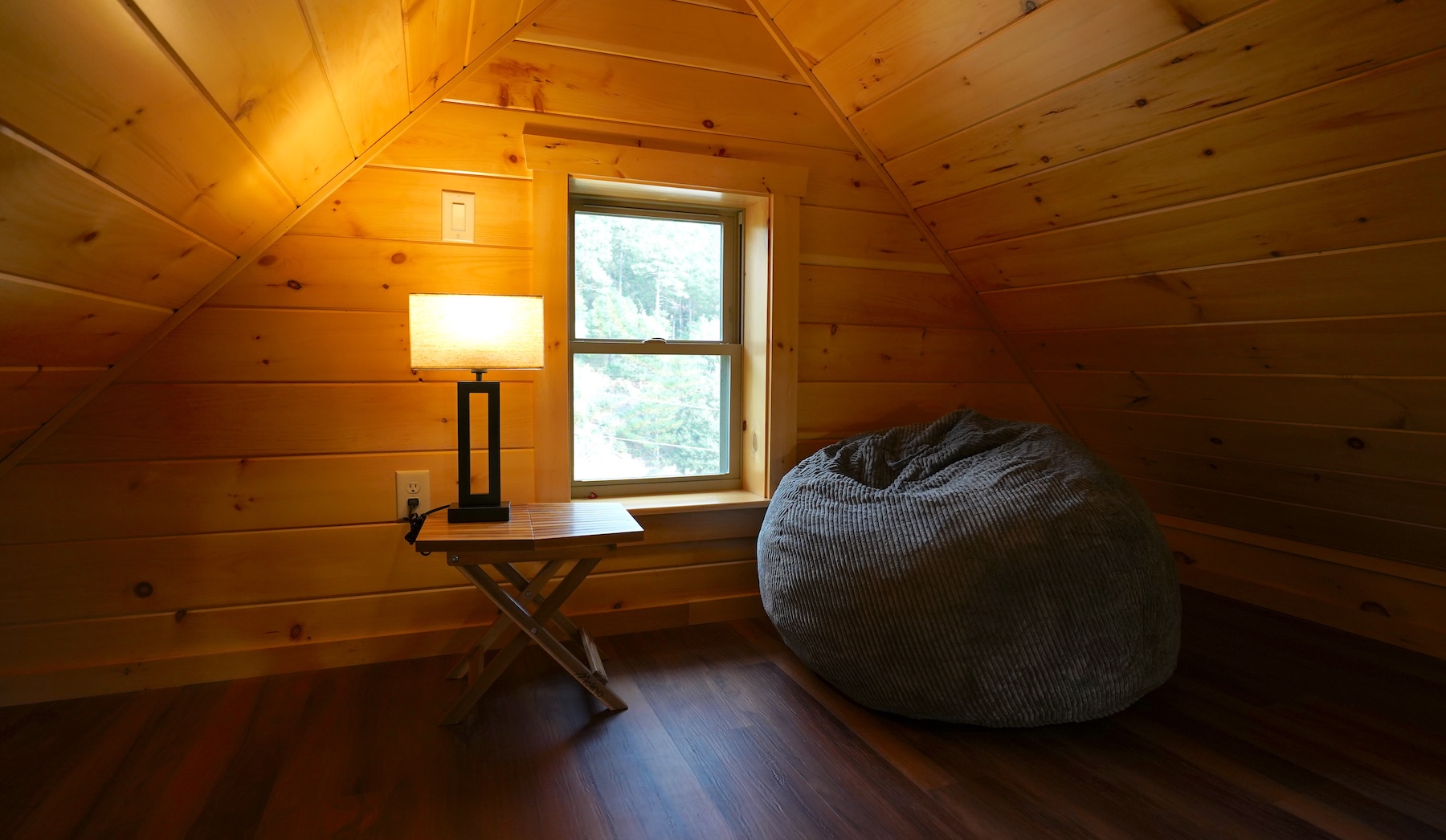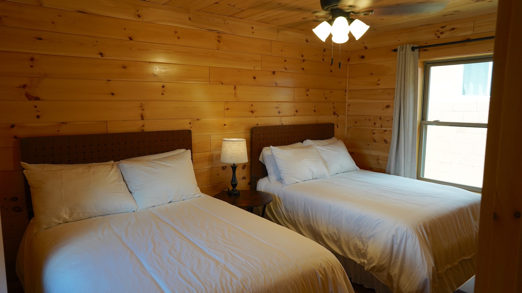 On either end of the main living space, you’ll find two private bedrooms, each offering easy comfort for adults. Above them, accessed by built-in ladders, are two open lofts—an adventurous hideaway for kids or the young at heart. With room for up to four adults and four children, this cabin balances shared space and privacy in a layout that feels both fun and functional.